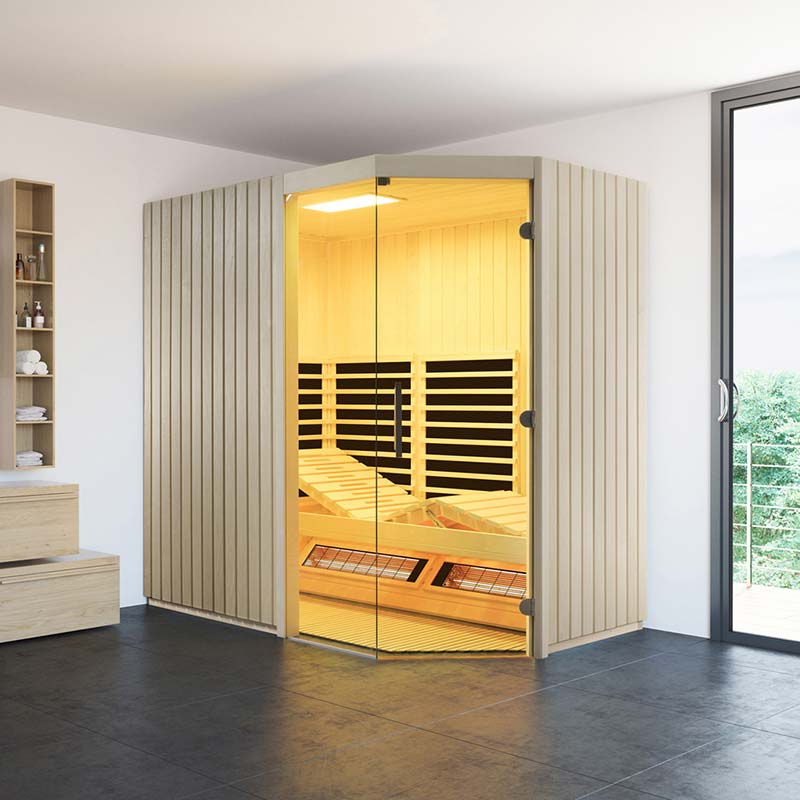 Hochwertiges Tannen- und Espenholz, große Glaselemente, LED-Farblicht und ein integriertes Bluetooth-Audiosystem sorgen für ein exklusives Wellnesserlebnis.